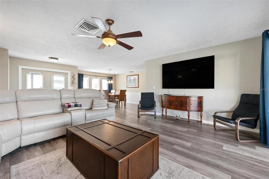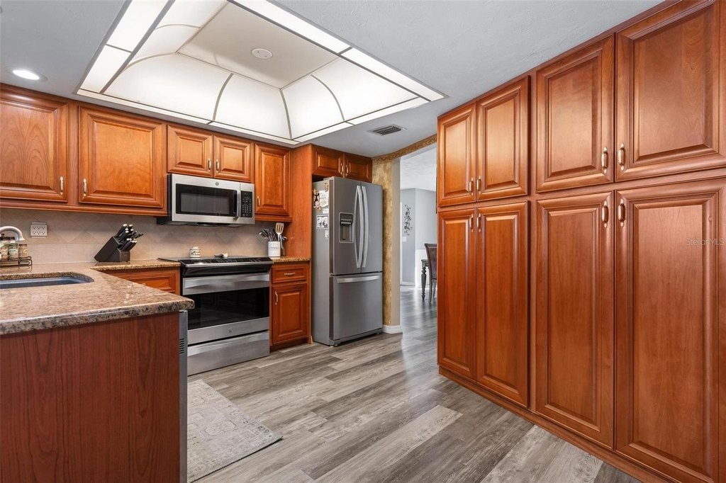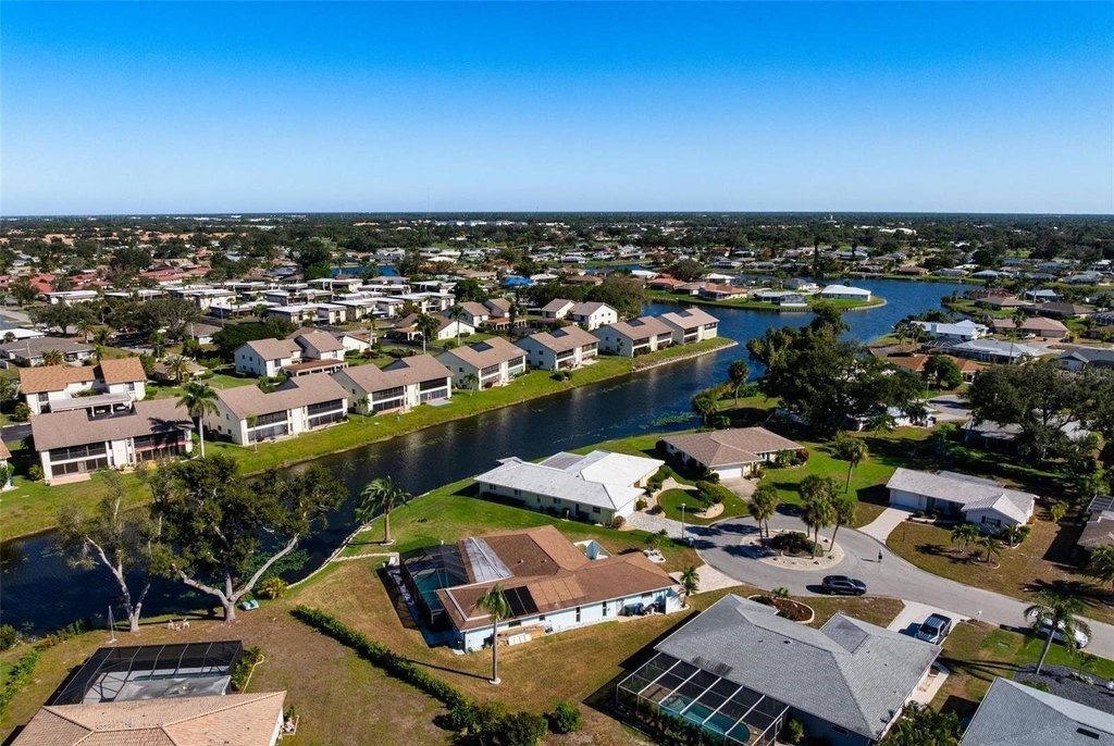 Perfectly positioned at the end of a quiet cul-de-sac, this sought-after 3 bedroom/3 bath spacious floor plan is located in the popular Jacaranda West community and offers wraparound water views of Claw Lake in a truly tranquil setting. A paver driveway welcomes you to an elegant arched courtyard entry, opening to an interior finished with easy-care tile, travertine, and laminate flooring throughout—no carpet. Set on nearly one-third of an acre, the property features a generous side yard ideal for a fenced dog run and an exceptional outdoor living space with multiple covered seating areas surrounding the caged and heated pool. The beautifully updated eat-in kitchen showcases extensive wood cabinetry, granite countertops, matching stainless steel appliances, and a convenient pass-through bar to the pool area—perfect for entertaining. A charming paver pathway leads directly to the lake, inviting you to fish from your own backyard or relax on the lanai while watching herons, egrets, and osprey in their natural habitat. Additional highlights include storm shutters throughout, re-piped plumbing, and a new AC in 2021, providing peace of mind for years to come. Enjoy low HOA fees while remaining centrally located just 15 minutes from sandy beaches, historic downtown Venice, downtown Wellen Park, and a wide array of shopping and dining options.